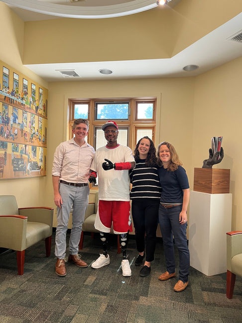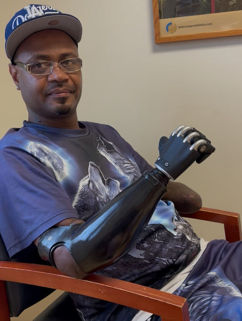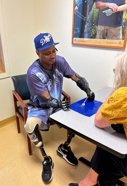 Reno and his wife traveled with the assistance of medical transportation from Long Island to Handspring's Middletown, NY clinic for specialized upper limb prosthetic care. He received care from Chris Fink, MSPO, CPO, Leah Sucato, MSPO and Debra Latour, OT, PP-OTD, M.Ed., OTR/L, FAOTA. Reno had the opportunity to trial various multi-articulating hand terminal devices. He ultimately chose Aether Biomedical's ZEUS S hand. What he likes most about the ZEUS hand is that it has a strong and powerful grasp, is durable, is field serviceable and his prosthetic team can connect virtually to his hands to make adjustments to his settings as his muscles become stronger and he improves his myoelectric control.